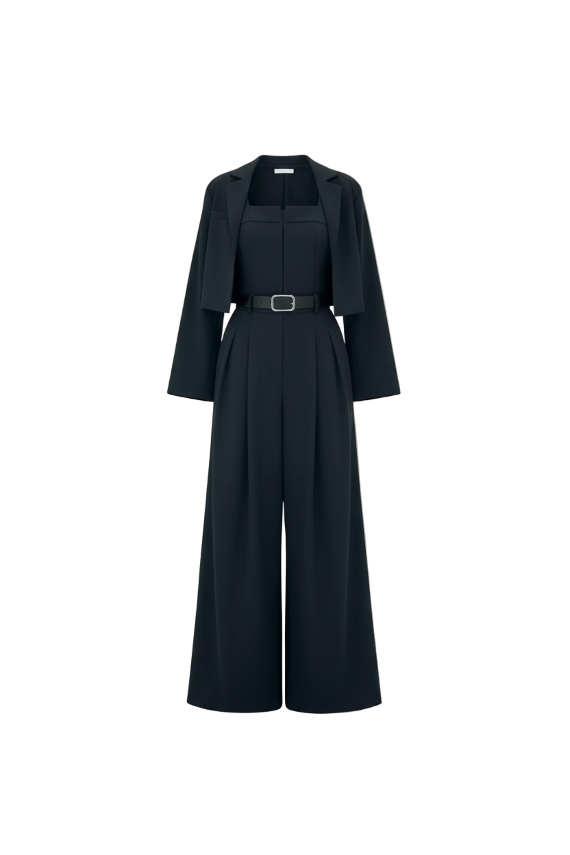 È stato progettato con pantaloni larghi ultra-trendy, un bustier strutturato e una giacca fluente abbinata per esaltare tutte le silhouette.