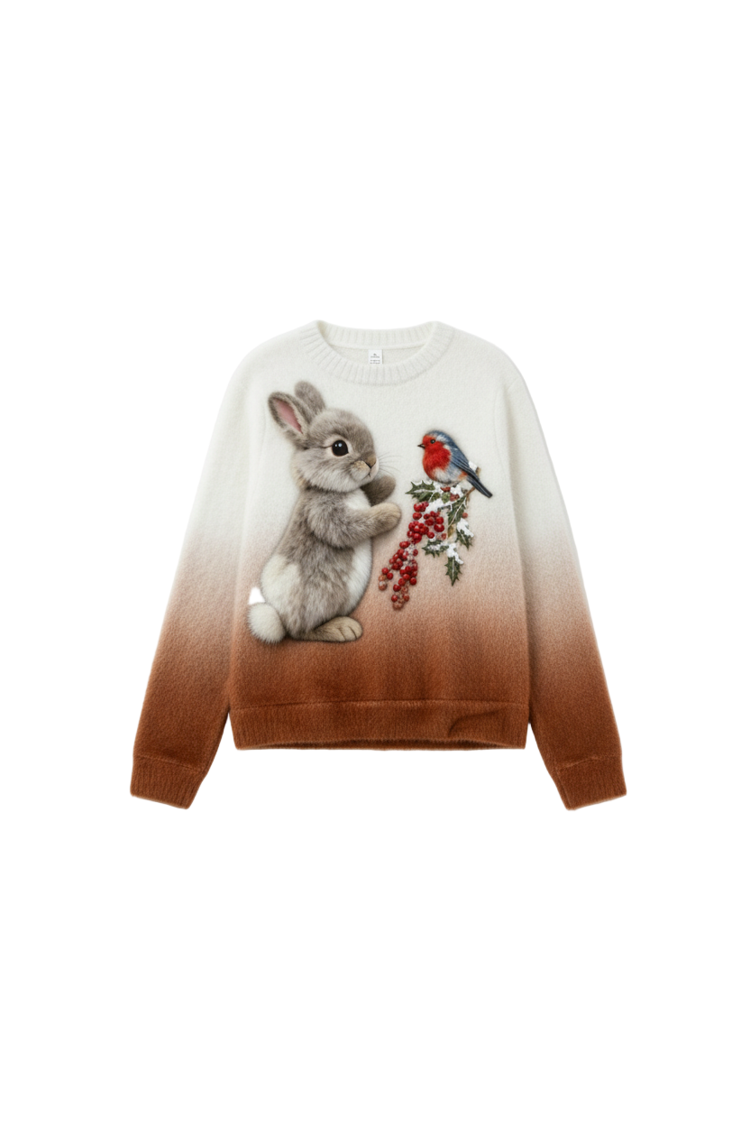 Festeggia la stagione con stile con questo delizioso maglione in peluche, caratterizzato da un adorabile coniglio e un vivace design di agrifoglio. Soffice al tatto e meravigliosamente accogliente, il maglione Olivia aggiunge un tocco di fantasia e allegria natalizia al tuo guardaroba.
